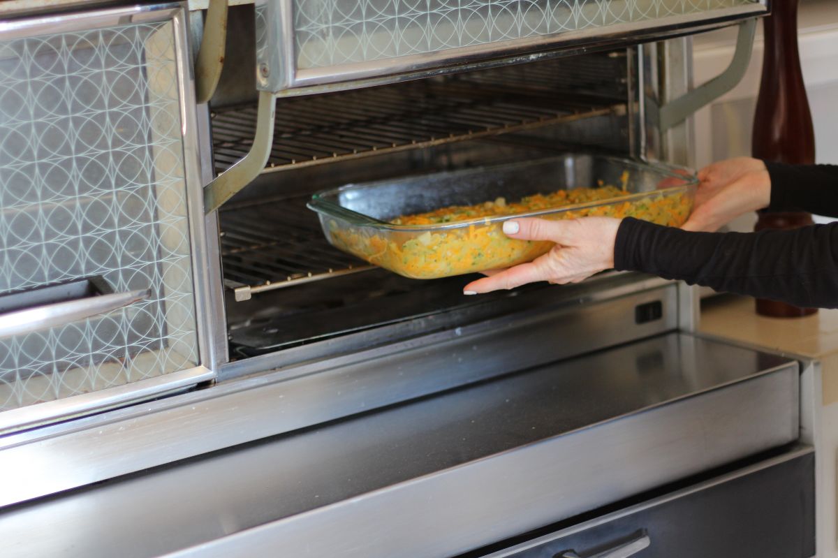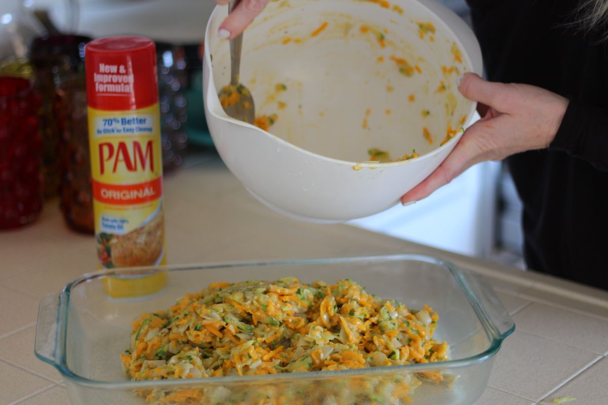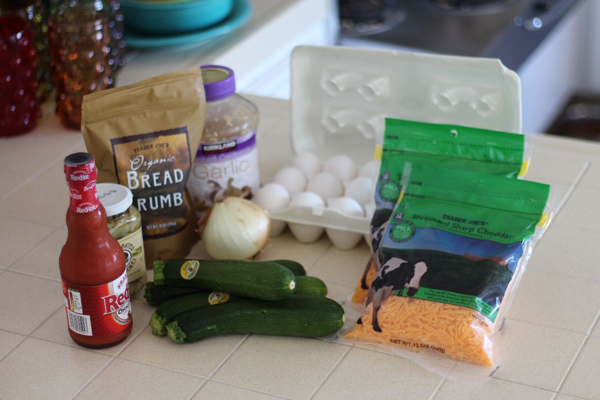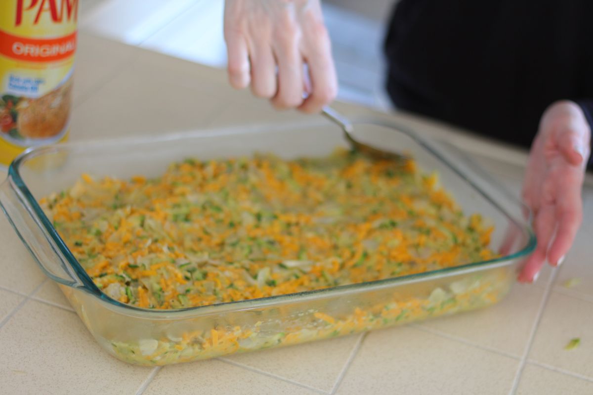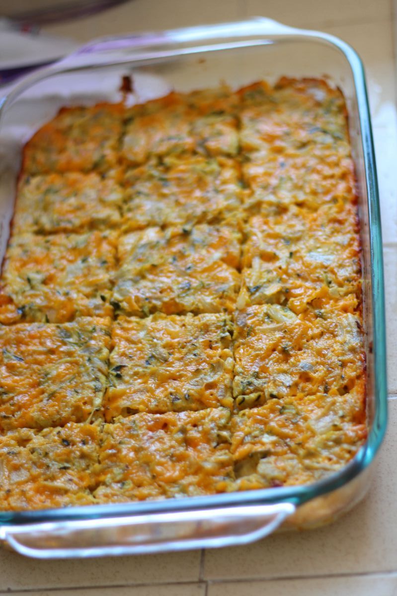 Start by sauteing 1 chopped onion and 1 clove of garlic in 2 tablespoons of juice from a 12 oz jar of marinated artichoke hearts then grate and add in 4 small zucchini and saute for about a minute. Let the sauteed mixture sit while you mix the following in a bowl: 4 beaten eggs, 16 ounces of grated sharp cheddar, a little hot sauce, a pinch of oregano and 2 tablespoons of bread crumbs (gluten-free bread crumbs work just as well). Chop up all of the artichoke hearts – without the remaining juice – and add to the bowl along with the sauteed mixture. Spoon it all into a greased 9 x 12 pan and smooth it out: