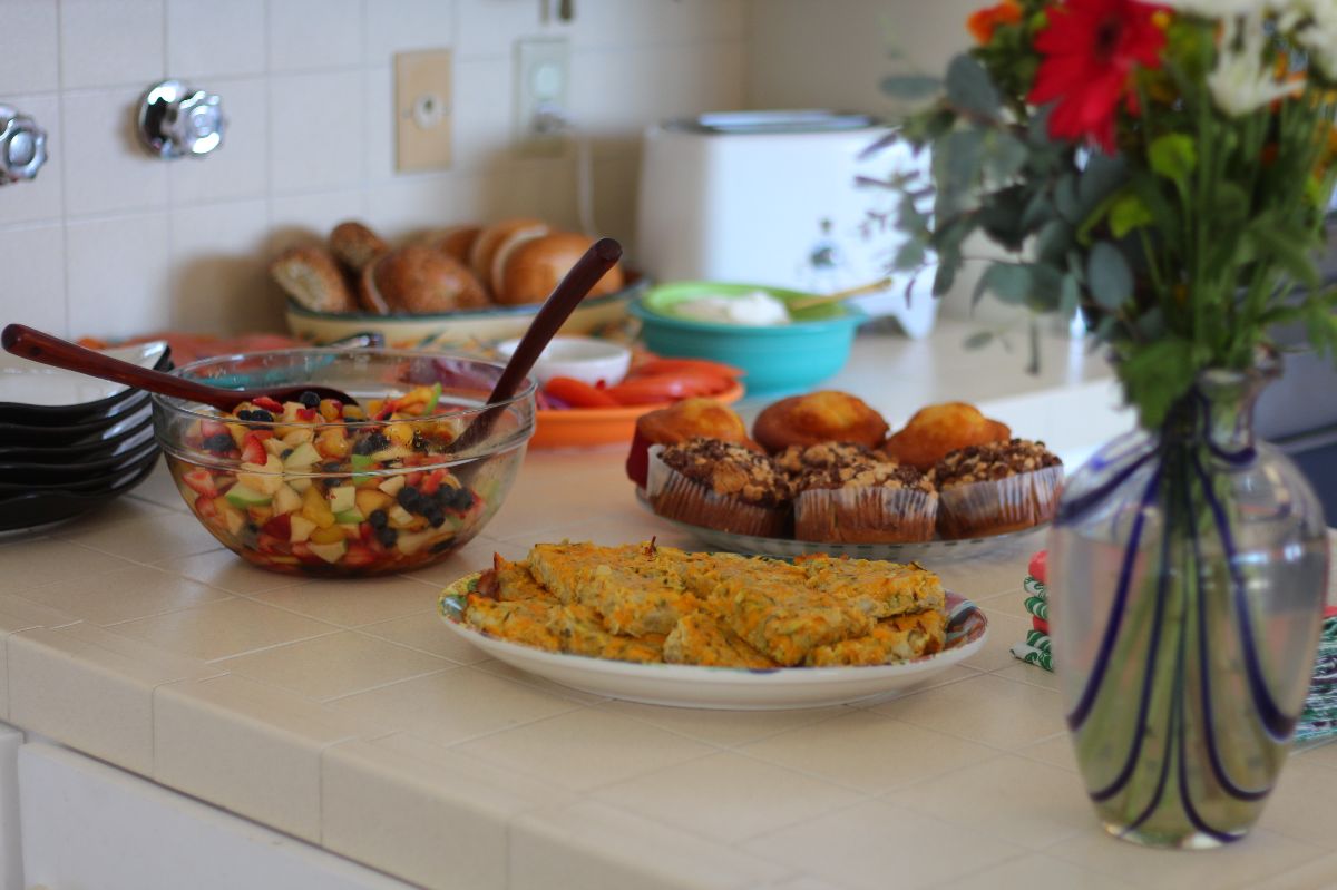 This weekend I held my first brunch at our new house! Brunch is one of my favorite meals to host and also the easiest for me to prepare. My standard brunch menu consists of fruit salad, muffins, bagels (with lox, cream cheese, tomatoes, onions and capers), a bar area with juice, coffee and champagne plus my crowd-pleasing Artichoke Heart + Zucchini Frittata Squares!