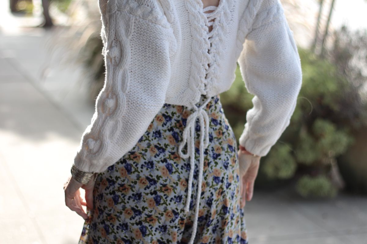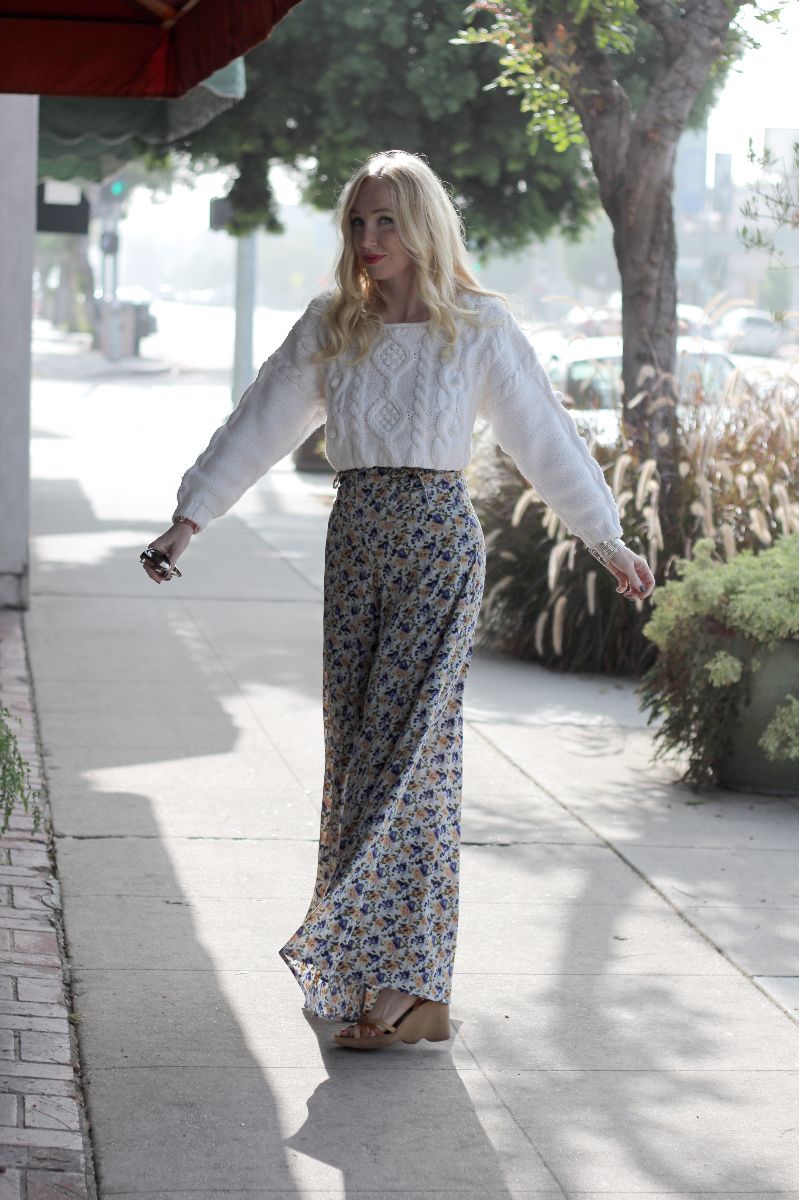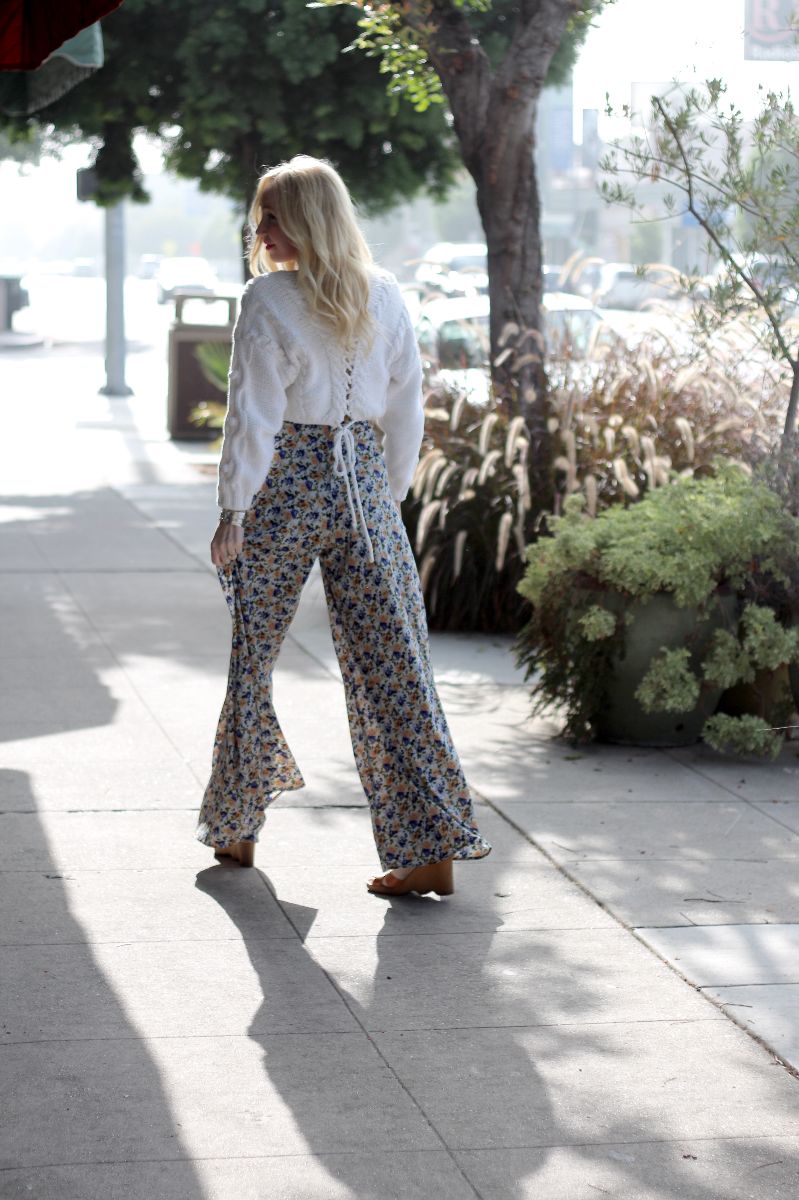 Look at these great pants! I found them at an estate sale in Pacific Palisades a couple of weeks ago and wore them today for the first time – I love the super-high waist and long, flowy legs. I picked up this lace-back sweater at my favorite Goodwill store months ago and when I spotted the pants I knew they were meant to be together.