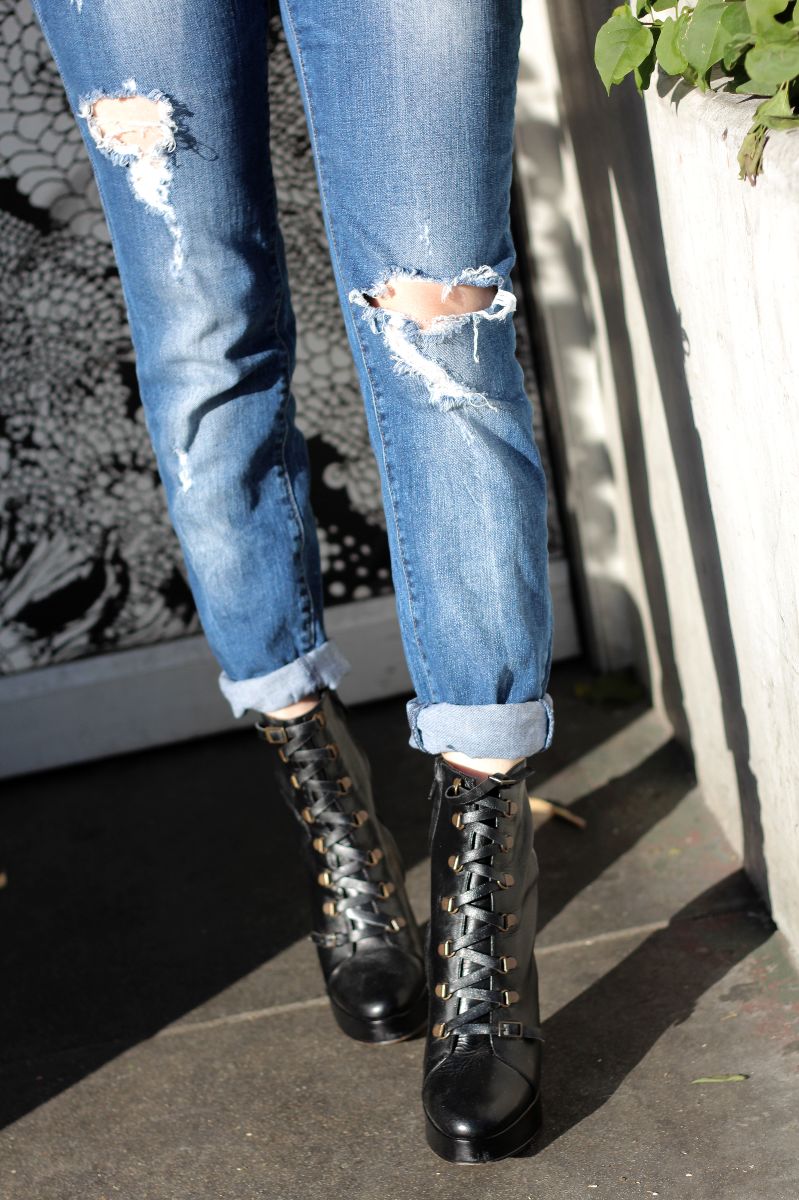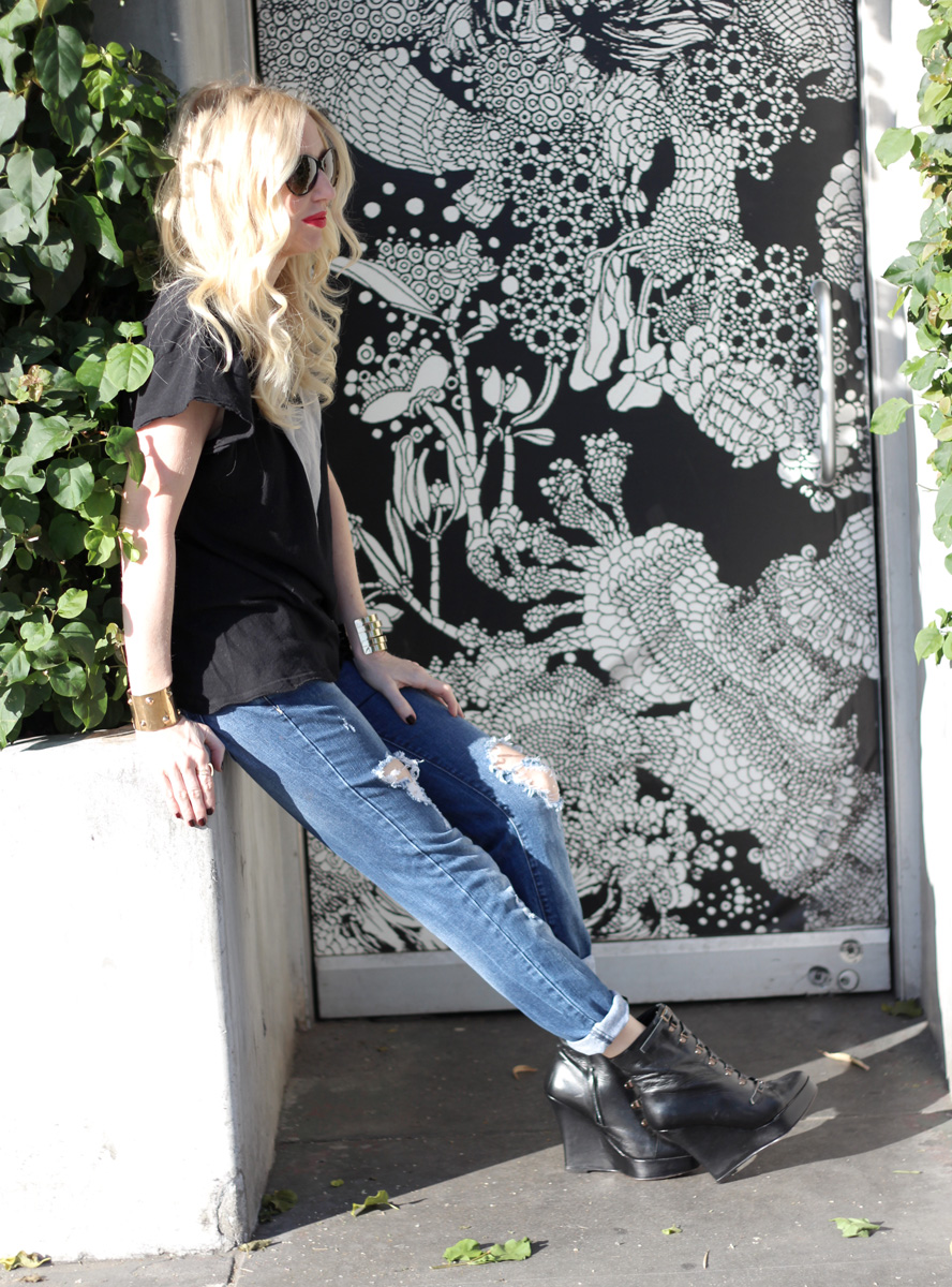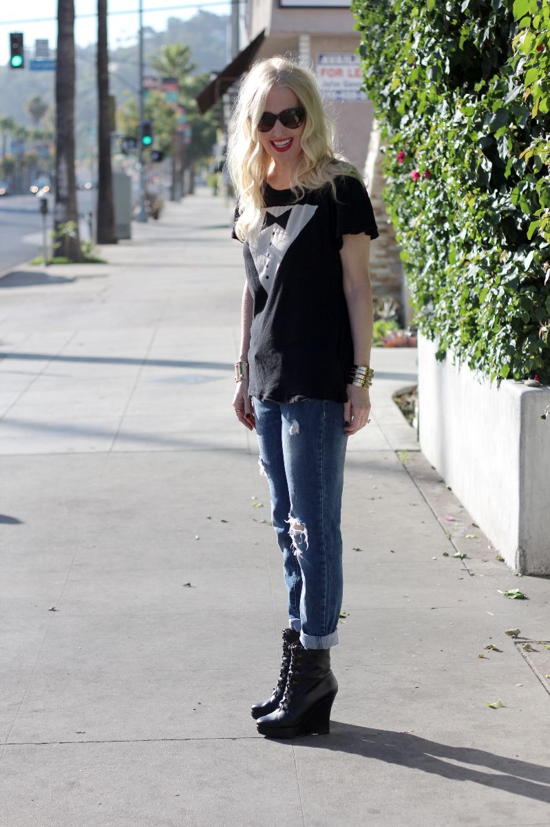Good Morning! As you can see, I got all dressed up to grab coffee this morning. I thought this faux-tuxedo tee from Wildfox would jazz up my distressed Zara jeans and favorite boots from Opening Ceremony.